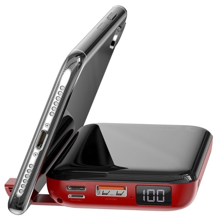 Компактность, ёмкость , возможность использовать кабель USB-C для зарядки аккумулятора. Есть подставка для телефона.