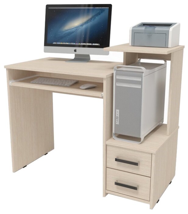 Хороший крепкий стол, небольшой, но функциональный - есть место под системный блок, два ящичка (очень важно для меня) и место под принтер, но я использую, как доп. место, где у меня стоит органайзер, настольная лампа и др.