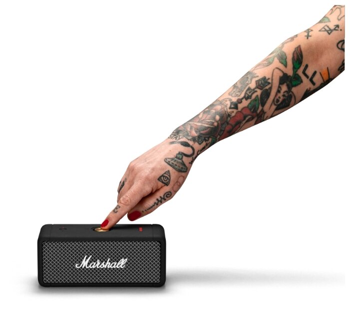 Большой запас громкости для столь компактной колонки - она играет заметно громче, чем более крупная STOCKWELL II, с которой инженеры Zound Industries AB Stockholm, разрабатывающие портативную акустику и наушники под легендарным брендом и логотипом Marshall, явно что-то накосячили, напортачили, сделав её довольно тихой, с малым запасом громкости для таких габаритов. Marshall EMBERTON куда компактнее, фактически карманная Bluetooth-колонка, в сравнении с носимой за "гитарный" ремень портативной беспроводной акустикой этого же бренда - STOCKWELL II, но играет "малышка" EMBERTON значительно громче. У EMBERTON вроде как заявлена защита от воды IPX7, то есть падение в бассейн или попадание под проливной дождь, ей не страшны.