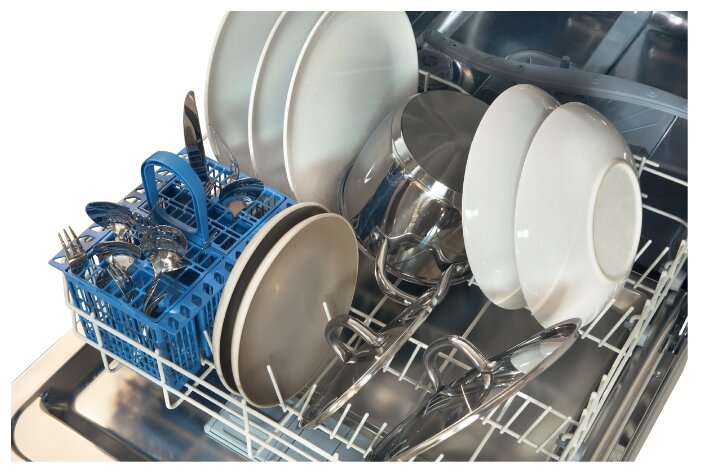 Посуду отмывает достаточно хорошо, бокалы из по чая и тарелки отмывает так, что всё блестит. Кастрюли и сковородки моет тоже не плохо. Есть дополнительный лоток для длинных ложек или приборов. достаточно удобная в управлении.