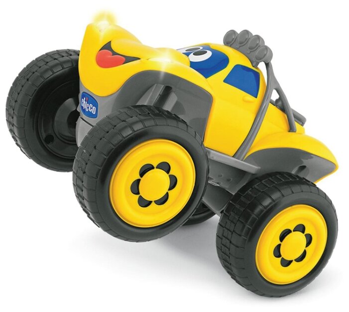 А я хочу рассказать об удивительной машинке на радиоуправлении от Chicco Билли большие колеса! У нас таких Билли два – красный и желтый! Билли на самом деле красавчик – красный (или ярко желтый) , яркий, колеса и вправду очень большие и он без труда преодолевает различные препятствия, настоящий внедорожник! Чтобы начать путешествие с Билли необходимо его включить – кнопки вкл-выкл находиться и на машинке внизу и на пульте. Это очень хорошо, если малыш не играет , то мы выключаем обе кнопочки и таким образом экономим батарейки. Как только включены обе кнопки можно ехать. На пульте управления, который выполнен ввиде руля есть кнопки – вперед, назад, и клаксон! На руле нет каких либо антенн (которые вечно ломаются, торчат и пытаются кого то задеть). Мы очень любим машинки с таким способом управления – они безопасны! При движении вперед у Билли горят передние фары (можно играть в темноте, они будут указывать дорогу, как два кошачьих глаза), при движении назад Билли издает пикающий звук – прочь с дороги, осторожно, и при нажатии сигнала мы слышим очень четкий и звонкий гудок! Как управлять – да очень просто, поворачивайте руль как на настоящем автомобиле, и Билли будет объезжать, врезаться или поворачивать – все зависит от вашего мастерства! Билли всегда веселый – на лобовом стекле у него нарисованы глазки , а на переднем бампере очень милая улыбка! Работает машинка от батареек (их необходимо вставить в руль и в саму машинки). Все отсеки тщательно закрыты с помощью болтиком (впрочем как и у всех игрушек этой фирмы), чтобы детки не смогли добраться самостоятельно до батареек. Так что если вы ищите шикарную, качественную и очень интересную игрушку своему малышу – Билли вас очень приятно порадует!