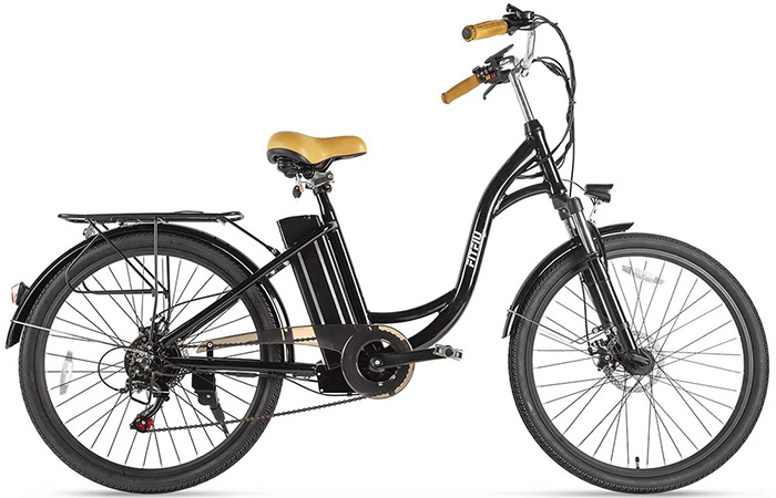 Эта модель не могла не появиться в рейтинге электровелосипедов. Окинув данный транспорт беглым взглядом, можно увидеть красивый классический байк с низкой рамой и хорошим багажником. Это неплохой вариант для путешествия по городу или поездок в магазин. Если познакомиться с ним поближе, то становится заметным наличие электродвигателя, который делает агрегат ещё более привлекательным.